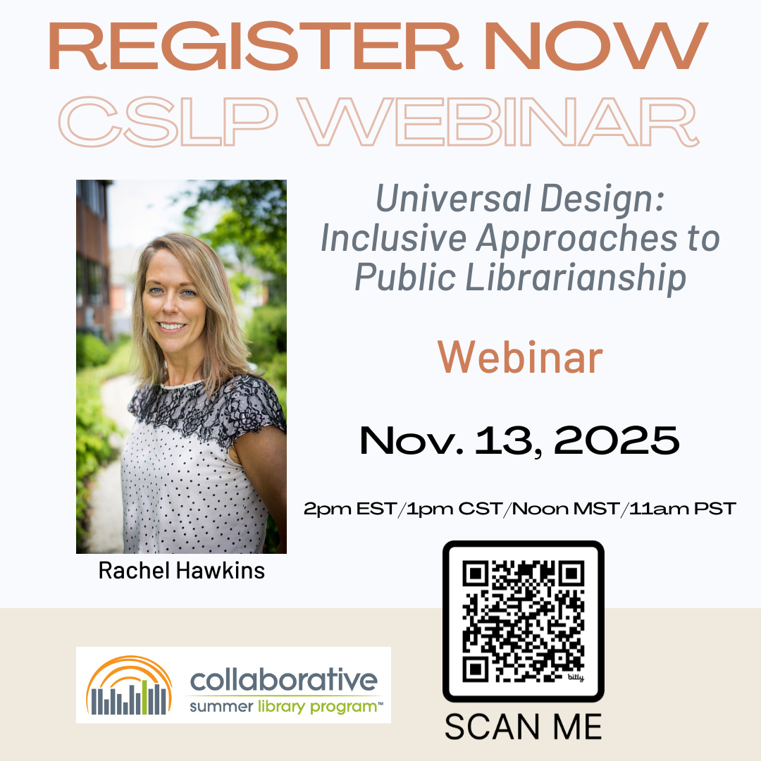 Join CSLP's Patron Access Committee as they welcome Rachel Hawkins in a presentation on Universal Design. Details available here<https://www.cslpreads.org/professional-development/> and registration<https://us02web.zoom.us/webinar/register/WN_xY2TSUK4Rc-fVMwzTkACJg> <https://us02web.zoom.us/webinar/register/WN_xY2TSUK4Rc-fVMwzTkACJg> is limited to live attendees, but it will be recorded and shared publicly on the website if you can't attend live.